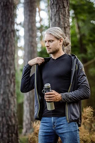 Thermo onderkleding voor heren, met lange mouwen en V hals. Warm en zacht van Merino wol gebreid in combinatie met de Dryan vezel. De ideale combinatie voor het behoud van lichaamswarmte.